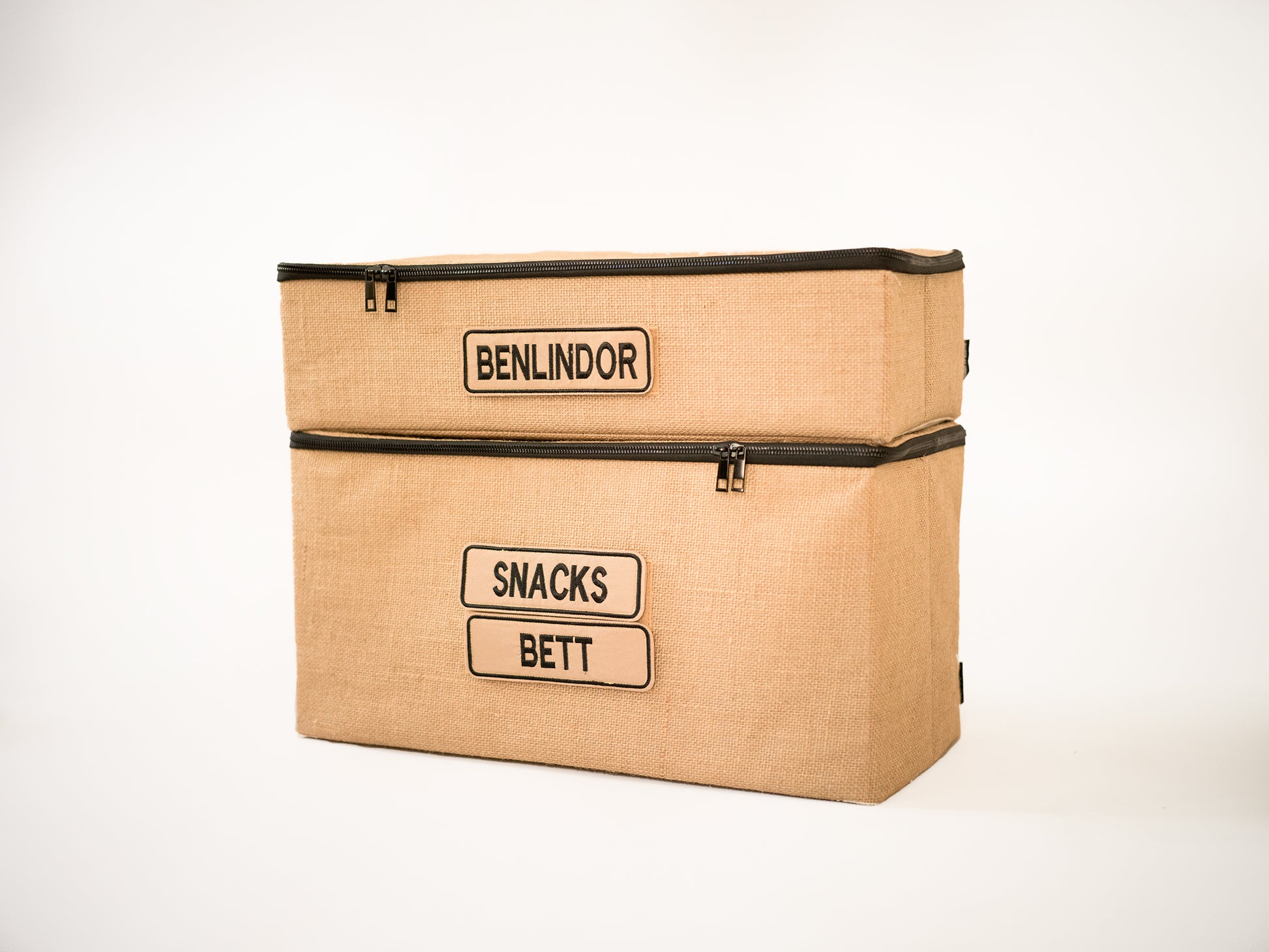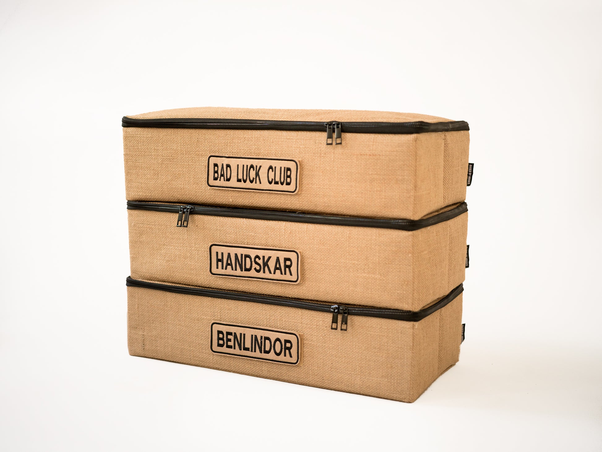 En box anpassad för stallmiljö. Utsidan gjord i jute. Insida gjord i off-white bomullstyg. Framsida kardborre för anpassade patches.