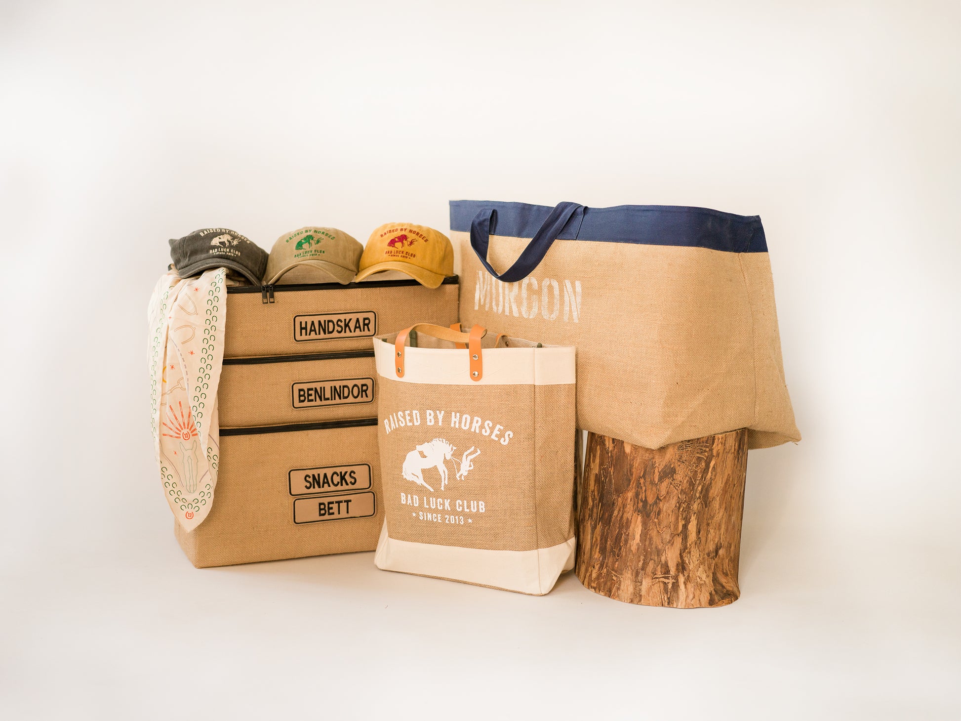 En jute tote bag. Tryck på båda sidorna. Handtag av läder. Insida av plast med förstärkta sömmar.